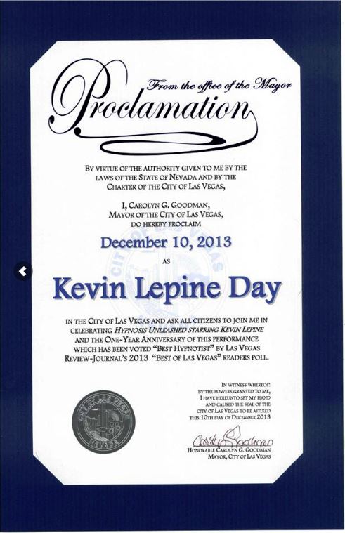- Dec 10th is Kevin Lepine Day in Las Vegas. Volunteer and be hypnotized into a star or laugh all night with Hypnosis Unleashed, the number one comedy and hypnosis show in Downtown Las Vegas. You best value in entertainment, Hypnosis Unleashed is downtown Vegas' favorite 9pm comedy show.